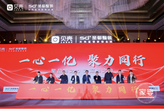 活动当天,圣都联合莫干山、兔宝宝、金牌、UU、全友、诗歌、美的、老板等众多大牌,正式启动“一心一亿”品牌联盟,为2026年打造更优质、更省心、更高性价比的家装,翻开新的篇章。